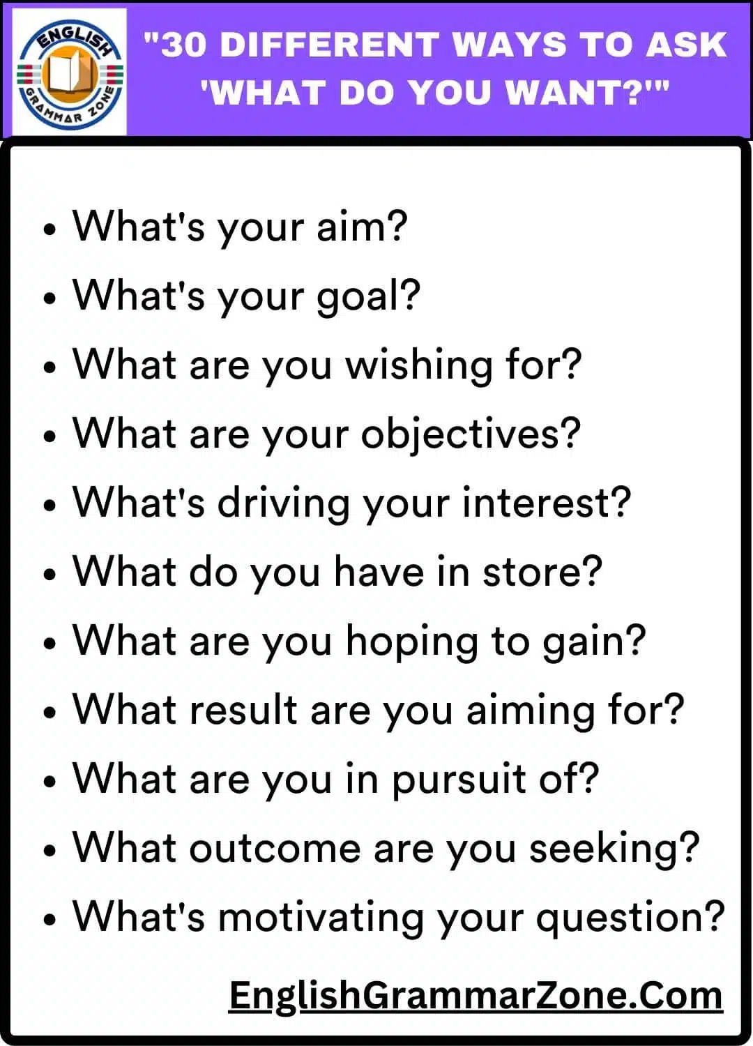 Mastering the ways to ask what do you want can greatly improve how you communicate in both personal and professional settings. By using different phrases, you can ensure that your questions are polite, friendly, and fitting for the situation. Whether you’re making a casual request or offering assistance, these variations allow you to express yourself with clarity and kindness, making your interactions smoother and more enjoyable.