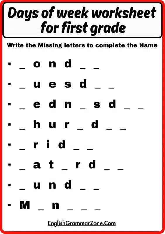 - Fill-in-the-blank: Children complete sentences by filling in the missing days of the week.