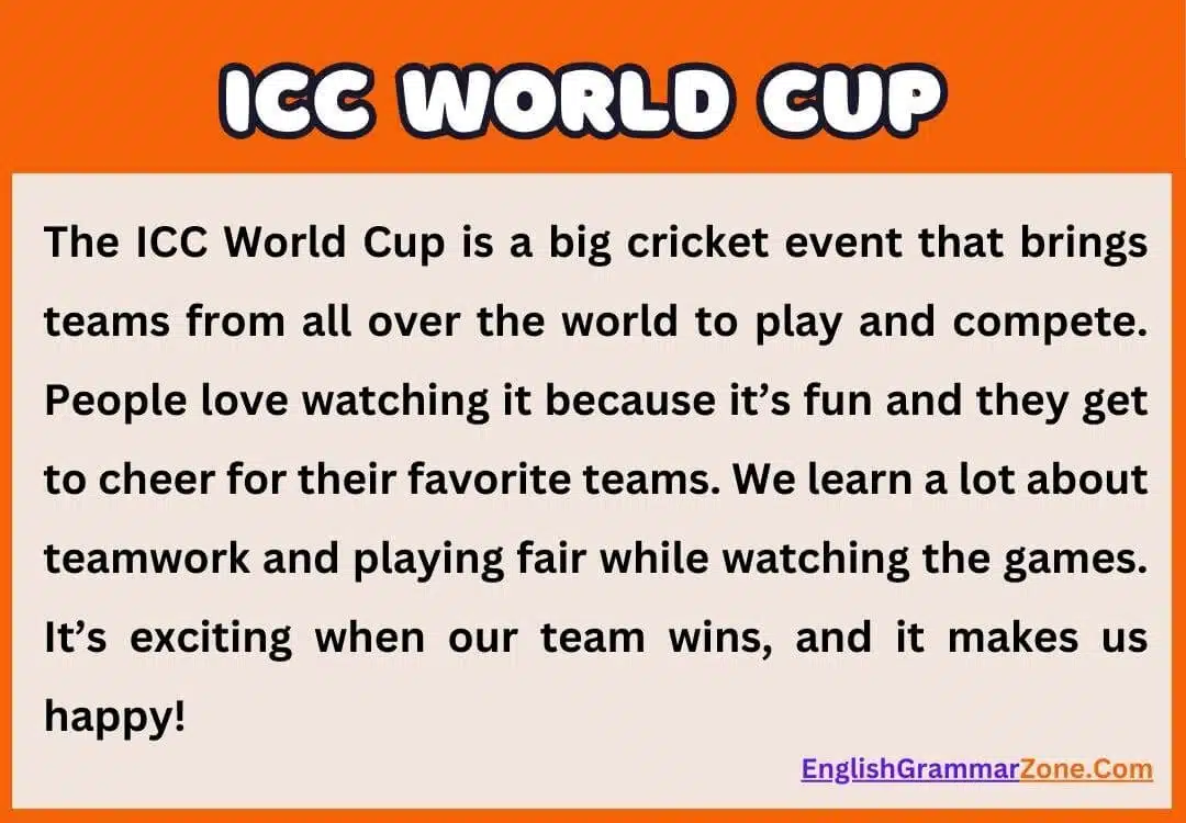 The ICC World Cup is an international cricket event that brings teams from across the globe to compete. Cricket is the sport played, and it’s loved because it combines strategy, skill, and excitement. Fans of all ages enjoy watching their national teams play because it brings them joy and pride. The World Cup is special because it teaches us about teamwork, as players must cooperate to win games. It also shows us the value of fair play, which is playing honestly and treating everyone nicely, even in a competitive game. I remember watching a game where a player admitted he was out even though the umpire didn’t notice. This honesty is what fair play is all about. Winning feels fantastic because it’s like your team accomplished a big goal together. Watching the World Cup, I dream about playing cricket too and being part of a team.