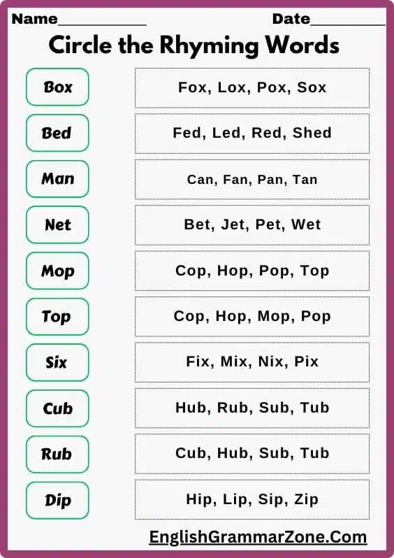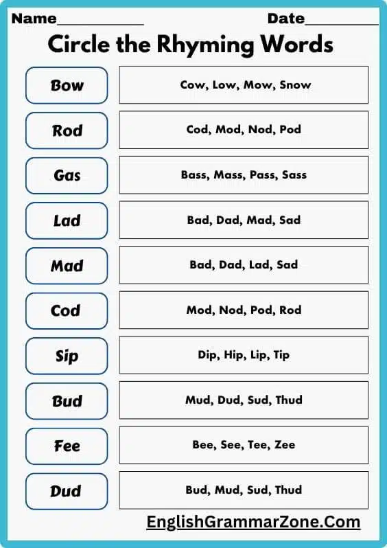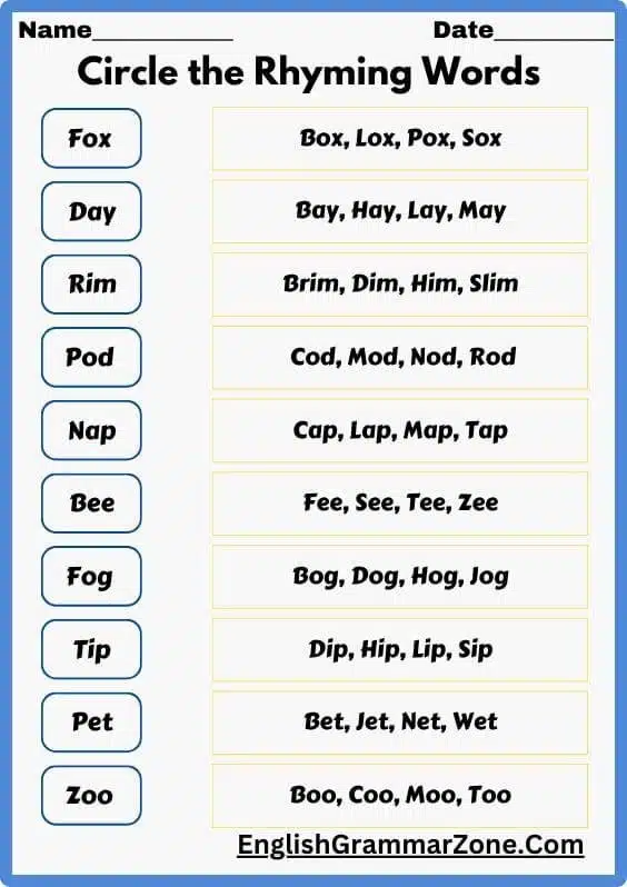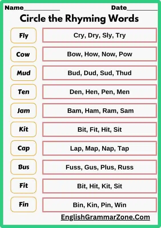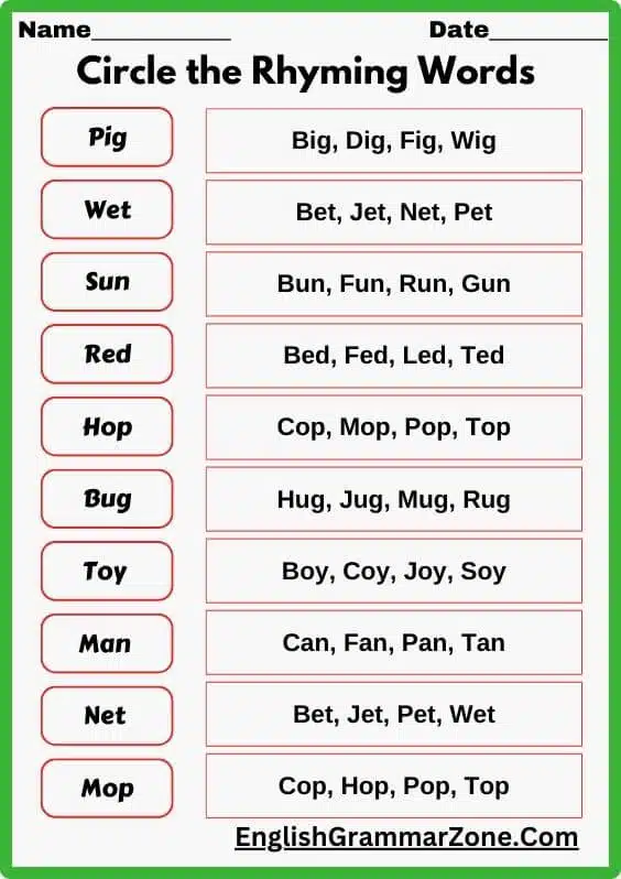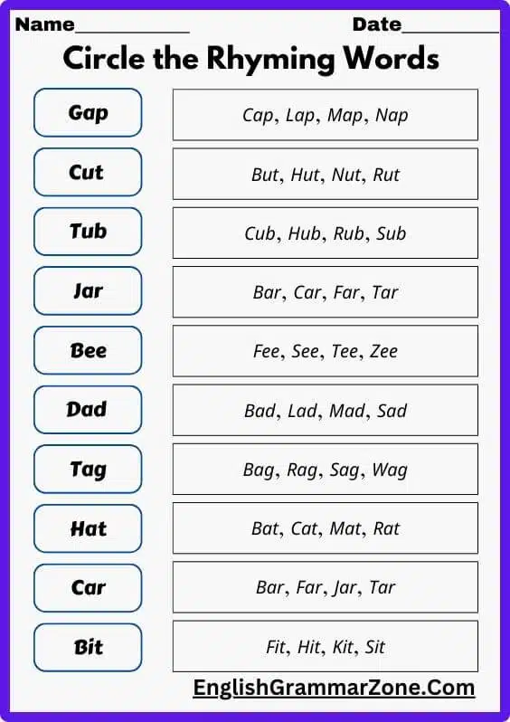 - Fill-in-the-Blanks: Completing sentences with rhyming words.